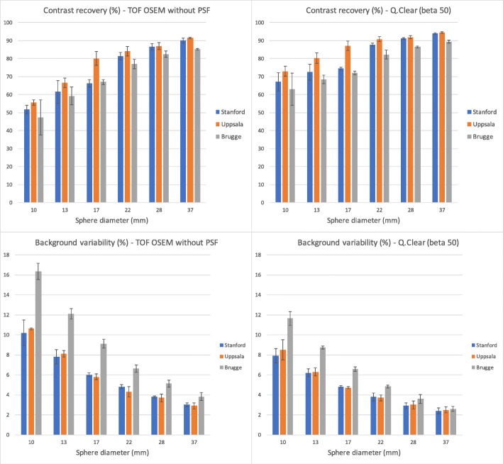 Results: Full width at half maximum (FWHM) of spatial resolution in radial, tangential and axial direction was 4.69, 4.08 and 4.68 mm at 1 cm; 5.58, 4.64 and 5.83 mm at 10 cm; and 7.53, 5.08 and 5.47 mm at 20 cm from the centre of the field of view (FOV) for the filtered backprojection reconstruction. For non-TOF ordered subset expectation maximization (OSEM) reconstruction without point spread function (PSF) correction, FWHM was 3.87, 3.69 and 4.15 mm at 1 cm; 4.80, 3.81 and 4.87 mm at 10 cm; and 7.38, 4.16 and 3.98 mm at 20 cm. Sensitivity was 7.258 cps/kBq at the centre of the FOV and 7.117 cps/kBq at 10-cm radial offset. Contrast recovery (CR) using the IQ phantom for the TOF OSEM reconstruction without PSF correction was 47.4, 59.3, 67.0 and 77.0% for the 10-, 13-, 17- and 22-mm radioactive spheres and 82.5 and 85.1% for the 28- and 37-mm non-radioactive spheres. Background variability (BV) was 16.4, 12.1, 9.1, 6.6, 5.1 and 3.8% for the 10-, 13-, 17-, 22-, 28- and 37-mm spheres. Lung error was 8.5%. Peak noise equivalent count rate (NECR) was 102.3 kcps at 23.0 kBq/ml with a scatter fraction of 41.2%. Maximum accuracy error was 3.88%. Coincidence timing resolution was 375.6 ps FWHM. Energy resolution was 9.3% FWHM. Q.Clear reconstruction significantly improved CR and reduced BV compared with OSEM.