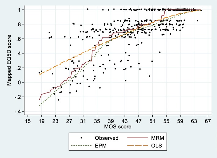 Results: In the training dataset, MRM and OLS, but not EPM, reproduced the observed mean utility (0.731). MRM, OLS and EPM under-estimated the standard deviation by 0.3, 26.6 and 1.7%, respectively. MRM had the lowest mean absolute error (0.143) and highest intraclass correlation coefficient (0.723) with the observed utility values, whereas OLS had the lowest mean squared error (0.038) and highest R-squared (0.542). Regressing the MRM- and OLS-mapped utility values upon body mass index and log-viral load gave covariate associations comparable to those estimated from the observed utility data (all P > 0.10). EPM did not achieve this property. Findings from the validation data were similar.