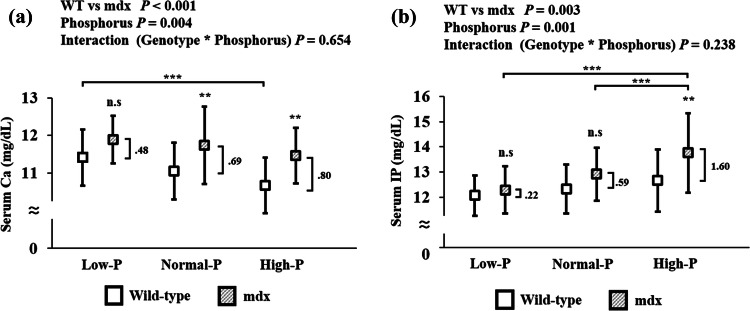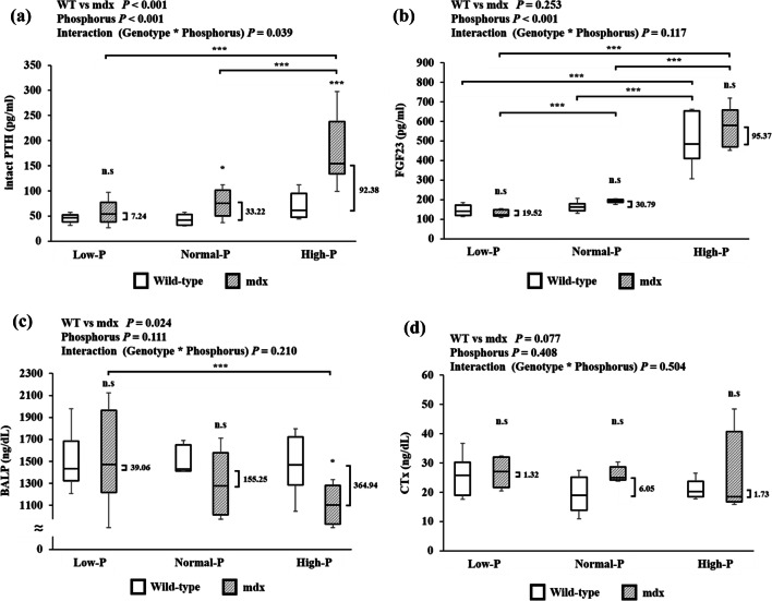 Duchenne muscular dystrophy is a severe muscular disorder, often complicated with osteoporosis, and impaired renal function has recently been featured. We aimed to clarify the involvement of renal function in the pathogenesis of mineral and bone disorder in mdx mice, a murine model of the disease. We clearly revealed renal dysfunction in adult mdx mice, in which dehydration and hypercalcemia were contributed. We also examined the effects of dietary phosphorus (P) overload on phosphate metabolism. Serum phosphate and parathyroid hormone (PTH) levels were significantly increased in mdx mice by dietary P in a dose-dependent manner; however, bone alkaline phosphatase levels were significantly lower in mdx mice. Additionally, bone mineral density in mdx mice were even worsened by increased dietary P in a dose-dependent manner. These results suggested that the uncoupling of bone formation and resorption was enhanced by skeletal resistance to PTH due to renal failure in mdx mice.