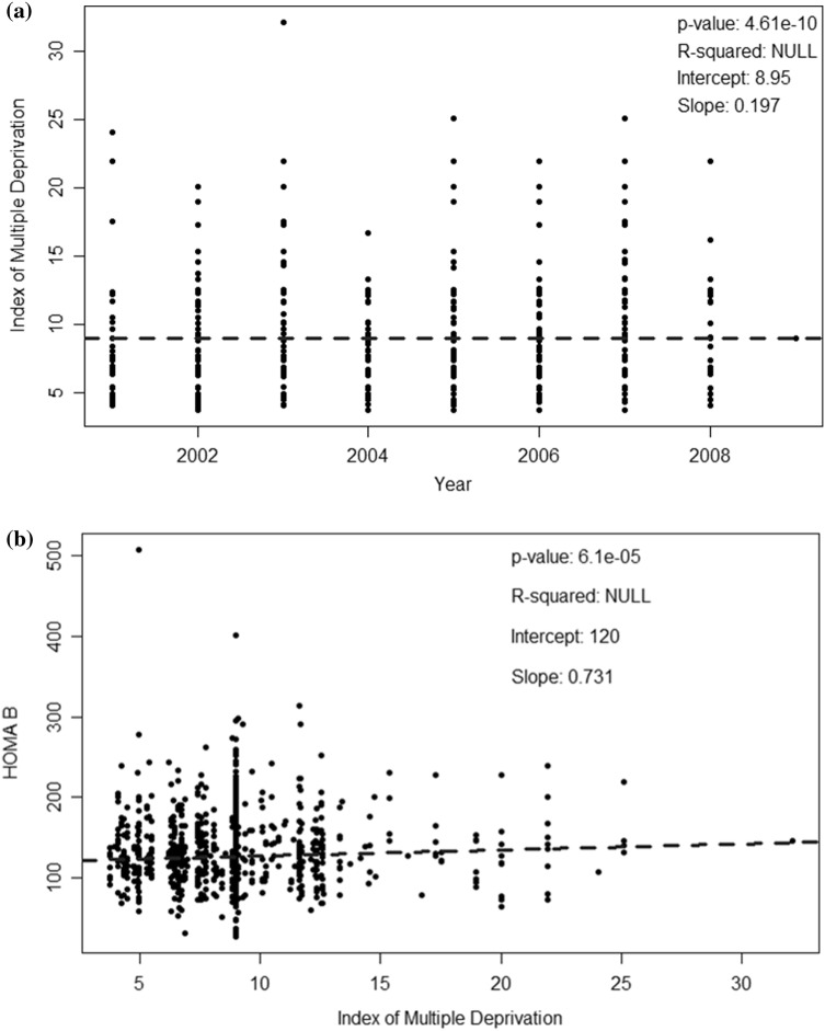 Results: There was a temporal increase in gestational diabetes incidence over the course of recruitment to this study [0.014 (0.005, 0.022) proportional increase per year, p = 2.1 × 10-3], but no seasonal effect (p = 0.7). HOMA B [- 0.015 (- 0.025, - 0.005) per year, p = 3.0 × 10-3] and the insulin disposition index [- 0.036 (- 0.060, - 0.013) per year, p = 3.0 × 10-3], unlike HOMA S, showed negative temporal trends. Risk factor analyses showed a concomitant temporal slight increase in the index of multiple deprivation [0.191 (0.138, 0.257) units per year, p = 4.6 × 10-10]. This index was positively associated with HOMA B (p = 6.1 × 10-5) but not directly with gestational diabetes (p = 0.6), HOMA S (p = 0.2) or the insulin disposition index (p = 0.4).
