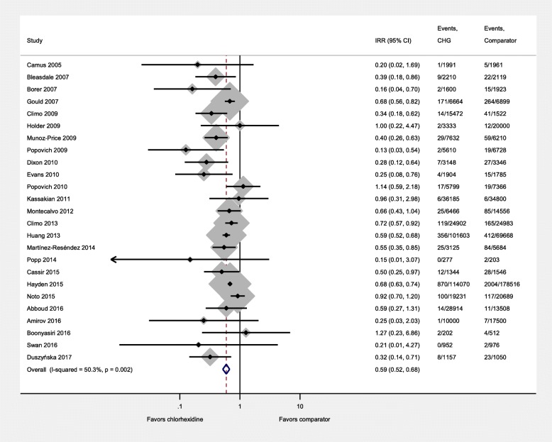 Results: We included 26 studies with 861,546 patient-days and 5259 HABSIs. CHG bathing markedly reduced the risk of HABSIs (IRR = 0.59, 95% confidence interval [CI]: 0.52-0.68). The effect of CHG bathing was consistent within subgroups: randomized (0.67, 95% CI: 0.53-0.85) vs. non-randomized studies (0.54, 95% CI: 0.44-0.65), bundled (0.66, 95% CI: 0.62-0.70) vs. non-bundled interventions (0.51, 95% CI: 0.39-0.68), CHG impregnated wipes (0.63, 95% CI: 0.55-0.73) vs. CHG solution (0.41, 95% CI: 0.26-0.64), and intensive care unit (ICU) (0.58, 95% CI: 0.49-0.68) vs. non-ICU settings (0.56, 95% CI: 0.38-0.83). Only three studies reported all five measures of fidelity, and ten studies did not report any patient-centered outcomes.