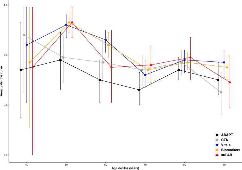 Results: The cohort included 22,653 (53.2%) middle-aged patients (age 40-69 years), and 19,889 (46.8%) older patients (aged 70+ years). Death within 7 days occurred in 139 patients (0.6%) in middle-aged patients and 596 (3.0%) of the older patients. The models based on vital signs and routine biomarkers had the highest area under the curve (AUC), and both were significantly better at discriminating 7-day mortality in middle-aged patients compared to older patients; AUC (95% CI): 0.88 (0.84-0.91), 0.75 (0.72-0.78), P < 0.01, and 0.86 (0.82-0.90), 0.76 (0.73-0.78), P < 0.001. In a subgroup of the total cohort (6.400 patients, 15.0%), the suPAR level was available. suPAR had the highest AUC of all individual predictors with no significant difference between the age groups, but further research in this biomarker is required before it can be used.