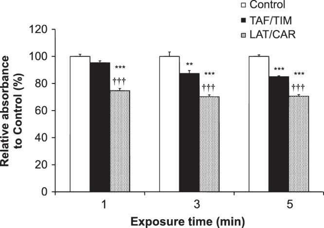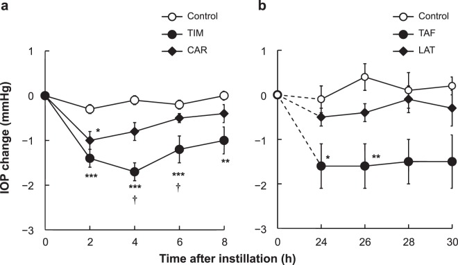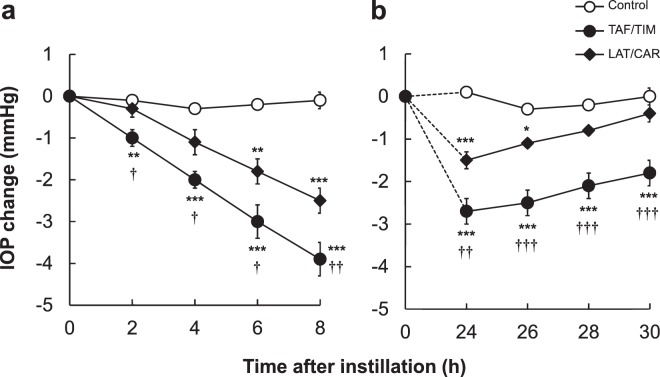 In this study, we made a comparative efficacy and safety assessment of two different fixed combinations of drugs, viz., tafluprost/timolol (TAF/TIM) and latanoprost/carteolol (LAT/CAR), by determining their effects on intraocular pressure (IOP) in ocular normotensive monkeys and examining their toxic effects on ocular surface using human corneal epithelial cells. TAF/TIM was found to be more effective in lowering IOP for a longer duration compared to LAT/CAR. We found that the difference in the intensity of IOP-lowering effect was because of the differences in the strength of timolol compared with that of carteolol as a beta-adrenergic antagonist and strength of tafluprost compared with that of latanoprost as a prostaglandin analogue. In addition, TAF/TIM showed much less cytotoxic effects compared to LAT/CAR on the human corneal epithelial cells. Our findings showed that TAF/TIM is better than LAT/CAR with regard to the IOP-lowering effect in monkeys and toxicity on ocular surface.