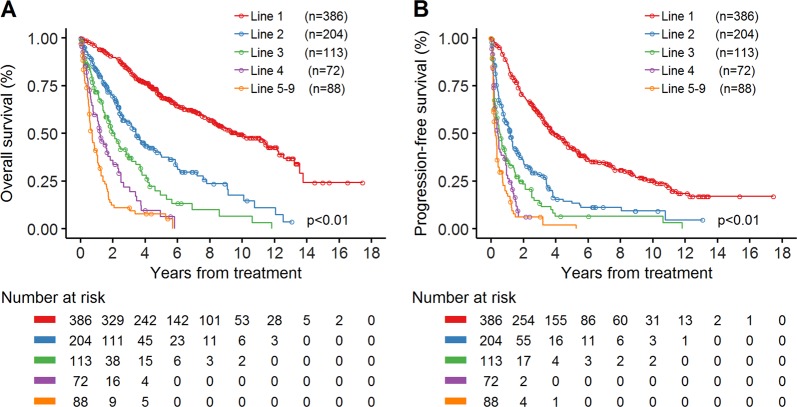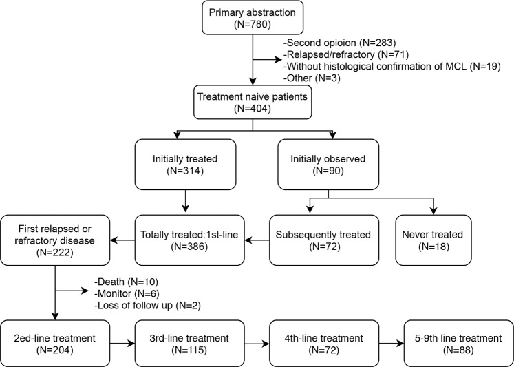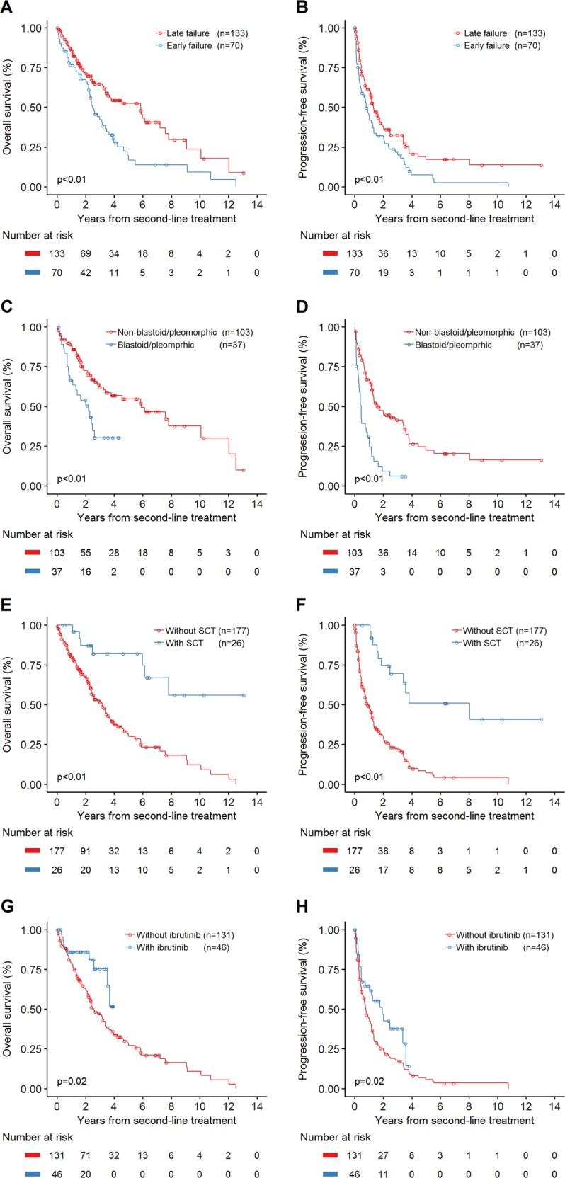 As the survival of patients with mantle cell lymphoma (MCL) continues to improve, patients are increasingly being treated with multiple regimens. However, outcome after each line remains poorly characterized in the modern era. To address this knowledge gap, we retrospectively studied 404 consecutive MCL patients who were managed between 2000 and 2014 at Memorial Sloan Kettering Cancer Center. Histologic diagnosis was centrally confirmed, and patients were followed longitudinally from diagnosis throughout their disease course. Progression-free survival (PFS) and overall survival (OS) were determined by Kaplan-Meier method. The median OS and PFS after first-line treatment were 9.7 and 4.0 years, respectively. After second-line therapy, the median OS and PFS were 41.1 and 14.0 months, third line were 25.2 and 6.5 months, and fourth line were 14.4 and 5.0 months. In patients less than 65 years, stem cell transplant (SCT)-based frontline regimens were associated with improved PFS compared with non-SCT regimens (median PFS: 86.2 versus 40.0 months; P < 0.01), with a trend toward longer OS (median OS: 165.0 versus 120.0 months; P = 0.06). Early treatment failure after first-line regimens was associated with worse OS (5.9 versus 2.5 years; P < 0.01). Our study should facilitate establishing proper endpoints for future clinical trials using novel treatment approaches.
