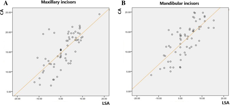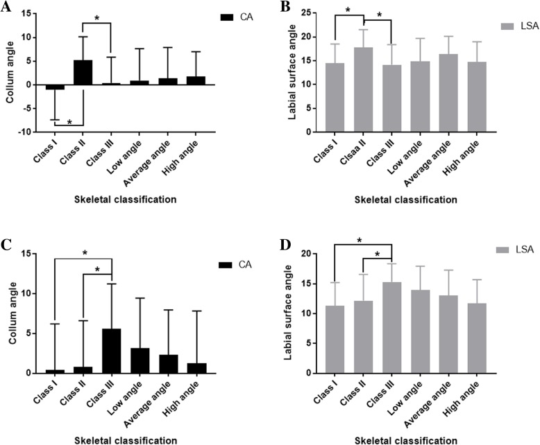 Results: The values of Collum angle and labial surface angle in maxillary incisor of Class II and mandibular incisor of Class III were significantly greater than other types of sagittal skeletal malocclusions (P < 0.05); no significant difference was detected among vertical skeletal malocclusions. Notably, there was also a significant positive correlation between the two measurements.