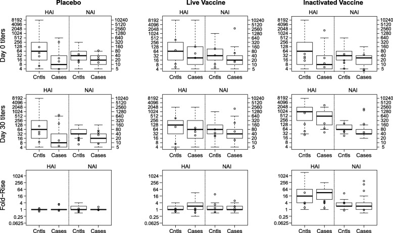 Results: IIV VE appeared to increase with Day 30 post-vaccination HAI titer, albeit not significantly (p=0.20 and estimated VE 14.4%, 70.5%, and 85.5% at titer below the assay lower quantification limit, 512, and 4096 (maximum)). Moreover, IIV VE increased significantly with Day 30 post-vaccination NAI titer (p=0.040), with estimated VE zero at titer 10 and 92.2% at highest titer 640. There was no evidence that fold-change in post-vaccination HAI or NAI titer associated with IIV VE (p=0.76, 0.38). For LAIV, there was no evidence that VE associated with post-vaccination or fold-rise HAI or NAI titers (p-values >0.40). For IIV, VE increased with increasing baseline NAI titer in those previously vaccinated, but VE decreased with increasing baseline NAI titer in those previously unvaccinated. In contrast, for LAIV, VE did not depend on previous vaccination or baseline HAI or NAI titer.