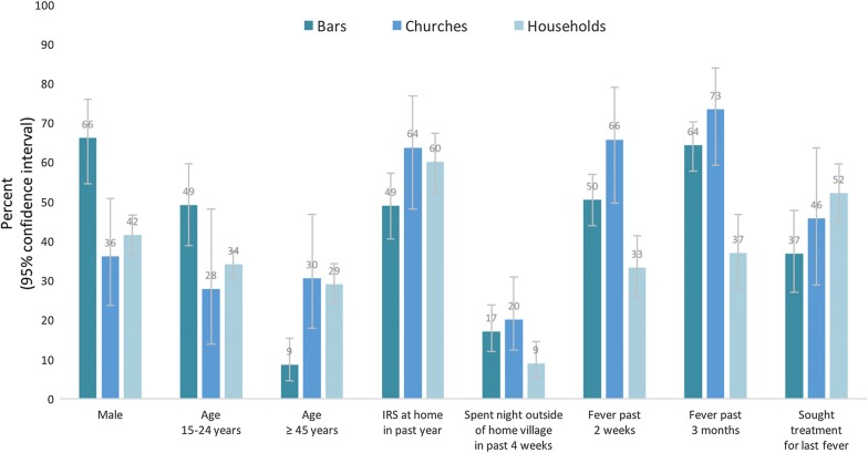 Results: When compared to a contemporaneous household survey of the general population aged 15 and older (N = 1160), venue-goers (N = 480) were more likely to have spent the night away from their home recently (17.3% vs. 8.9%, P = 0.008), report recent fever (65.2% vs. 36.9%, P < 0.001), and were less likely to have sought care for fever (37.9% vs. 52.1%, P = 0.011). Venue-goers had higher, but not significantly different, rates of malaria infection (4.7% vs. 2.8%, P = 0.740). Risk factors for malaria infection among venue-goers could not be determined due to the small number of infections identified, however self-reported fever was positively associated with outdoor livelihood activities (adjusted odds ratio [AOR] = 1.9, 95% CI 1.0-3.3), not wearing protective measures at the time of the survey (AOR = 6.8, 9% CI 1.4-33.6) and having been bothered by mosquitos at the venue (AOR = 2.7, 95% CI 1.5-4).