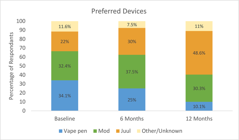 Results: Most (80.3%) were still using e-cigarettes at 12 months, and daily use increased from 14.5% to 29.8%. Model testing indicated an overall increase from baseline to 12 months in frequency of e-cigarette use (F(2, 166) = 5.69, p = .004), dependence (F(2, 164) = 5.49, p = .005), and cotinine levels (F(2, 103) = 4.40, p = .038). Among those reporting only e-cigarette use at baseline, 28.8% reported combustible cigarette use during follow-up. Among those reporting dual use at baseline, 57.1% were still dual using at 12 months, 31.4% reported e-cigarette use only, and none abstained from both products. Higher nicotine delivering e-cigarette devices (i.e., Juul, mods) became more popular over time, whereas flavor preferences (i.e., fruit, mint/menthol, and candy) remained stable.