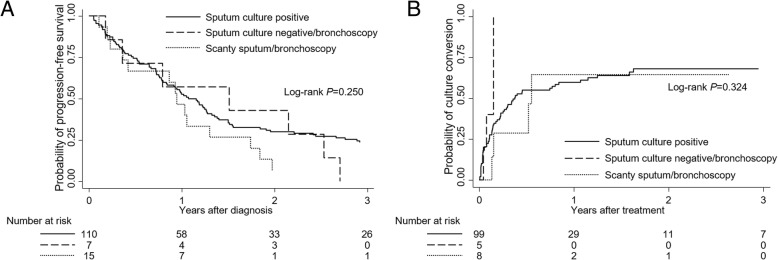 Results: Three hundred forty-seven patients were included in the analyses. Of these, 279 (80.4%) were diagnosed from two separately expectorated sputum specimens, and 68 (19.6%) were diagnosed from bronchoscopic specimens. Patients diagnosed from sputum specimens had more frequent and severe cough, sputum, postnasal drip, and high St. George's Respiratory Questionnaire scores. However, the extent and severity of the radiographic lesions, disease progression, and treatment responses were similar for both groups. Further analysis based on the following three groups (sputum culture positive, sputum culture negative/bronchoscopy, and scanty sputum/bronchoscopy groups) suggested that the scanty sputum/bronchoscopy group appeared to have the worst prognosis in terms of both time to progression and time to culture conversion.