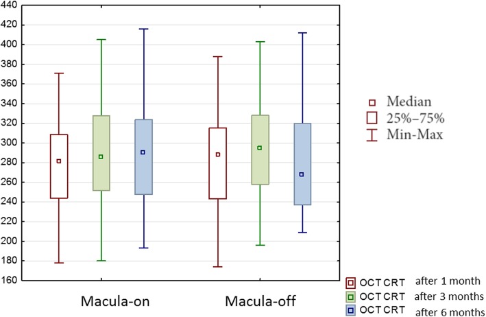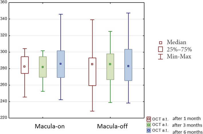 Results: Results of the Amsler test were abnormal postoperatively in 54% of the patients in the group with macula-off and in 32% of the patients with macula-on RRD. Horizontal M-charts improved significantly from 0.33 to 0.2, vertical M-charts- from 0.29 to 0.17 during 6 months of the follow-up. There was a significant increase in the central retinal thickness (CRT) and average thickness (AT) between follow-up examinations only in the macula-off group. 29 of 62 eyes (47%) after surgery (equally with macula-on and macula-off RRD) showed morphological changes in OCT in the macular region, as epiretinal membrane, macular edema, subretinal fluid or alterations of the outer layers of the retina. The average threshold in microperimetry increased significantly within both groups during the follow-up.
