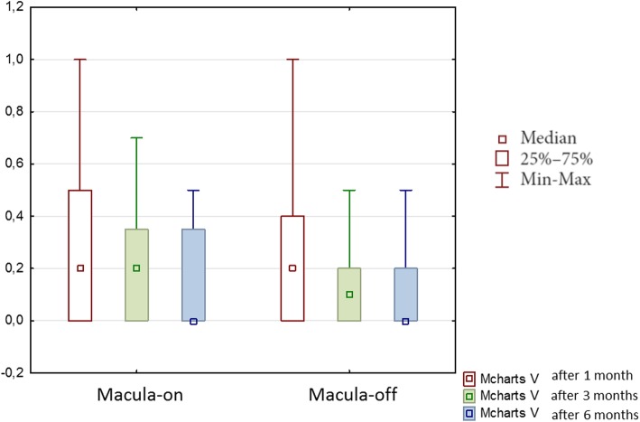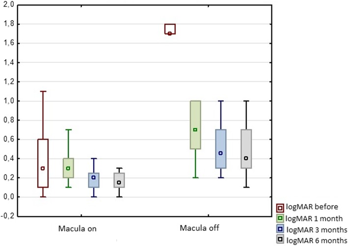 Conclusion: Both horizontal and vertical M-charts scores, as were as microperimetry sensitivity improved significantly during the 6 months of the follow-up both in macula-on and macula-off group. Although PPV with SF6 gas tamponade was successful, almost half of eyes revealed anatomical changes in the macular region in OCT both with macula-on and macula-off group.