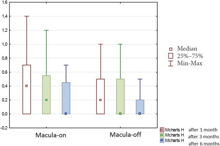 Methods: The study included 62 eyes that underwent successful PPV with SF6 tamponade with macula-on (34 eyes) and macula-off (28 eyes) RRD preoperatively. The best-corrected visual acuity (BCVA), Amsler test, M-charts, optical coherence tomography (OCT) and microperimetry were performed at 1, 3 and 6 months postoperatively.