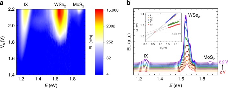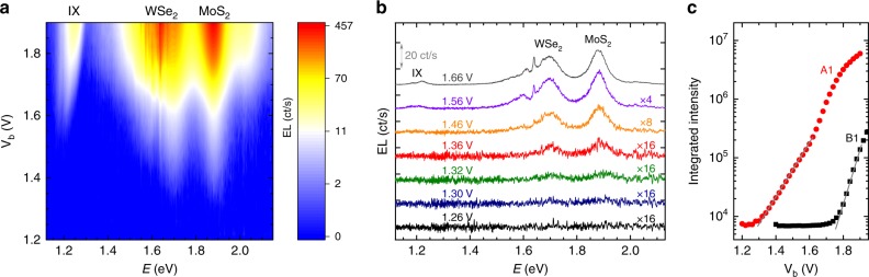The intriguing physics of carrier-carrier interactions, which likewise affect the operation of light emitting devices, stimulate the research on semiconductor structures at high densities of excited carriers, a limit reachable at large pumping rates or in systems with long-lived electron-hole pairs. By electrically injecting carriers into WSe2/MoS2 type-II heterostructures which are indirect in real and k-space, we establish a large population of typical optically silent interlayer excitons. Here, we reveal their emission spectra and show that the emission energy is tunable by an applied electric field. When the population is further increased by suppressing the radiative recombination rate with the introduction of an hBN spacer between WSe2 and MoS2, Auger-type and exciton-exciton annihilation processes become important. These processes are traced by the observation of an up-converted emission demonstrating that excitons gaining energy in non-radiative Auger processes can be recovered and recombine radiatively.