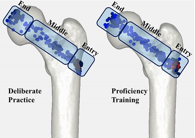 Methods: Fifty-five residents from four different medical centers participated in this study over the course of 2 years. The residents were divided into three groups: traditional training (included first-year residents from the University of Iowa, University of Minnesota, and the Mayo Clinic), deliberate practice (included first-year residents from the University of Nebraska and the University of Minnesota), and proficiency training (included first-year residents from the University of Minnesota and the Mayo Clinic). Residents in each group received a didactic introduction covering the task of placing a wire to treat an intertrochanteric fracture, and this was considered traditional training. Deliberate practice involved training on a radiation-free simulator that provided specific feedback throughout the practice sessions. Proficiency training used the same simulator to train on specific components of wire navigation, like finding the correct starting point, to proficiency before moving to assessment. The wire navigation simulator uses a camera system to track the wire and provide computer-generated fluoroscopy. After training, task performance was assessed in a mock OR. Residents from each group were assessed in the mock OR based on their use of fluoroscopy, total time, and tip-apex distance. Correlation analysis was performed to examine the relationship between resident performance on the simulator and in the mock OR.