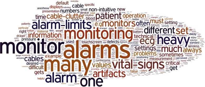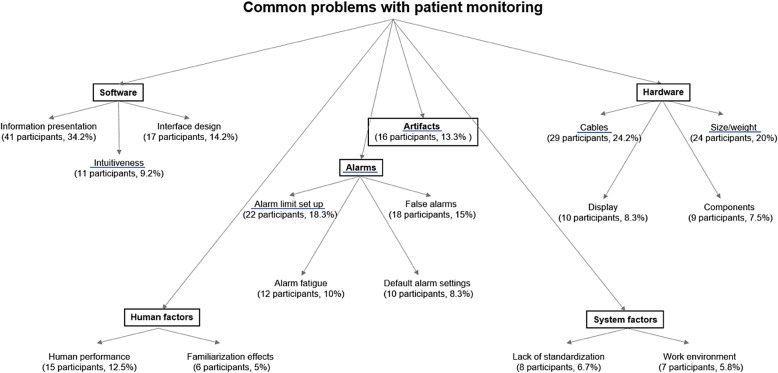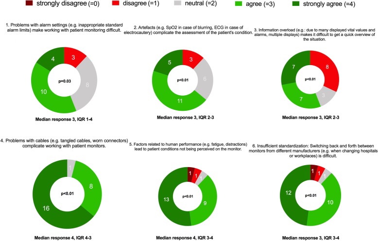 Results: We identified the following six main topics: 1. "Alarms," 2. "Artifacts," 3. "Software," 4. "Hardware," 5. "Human Factors," 6. "System Factors," and 17 sub themes. The central statements rated for the major topics were: 1. "problems with alarm settings complicate patient monitoring." (56% agreed) 2. "artifacts complicate the assessment of the situation." (64% agreed) 3. "information overload makes it difficult to get an overview quickly." (56% agreed) 4. "problems with cables complicate working with patient monitors." (92% agreed) 5. "factors related to human performance lead to critical information not being perceived." (88% agreed) 6. "Switching between monitors from different manufacturers is difficult." (88% agreed). The ratings of all statements differed significantly from neutral (all p < 0.03).