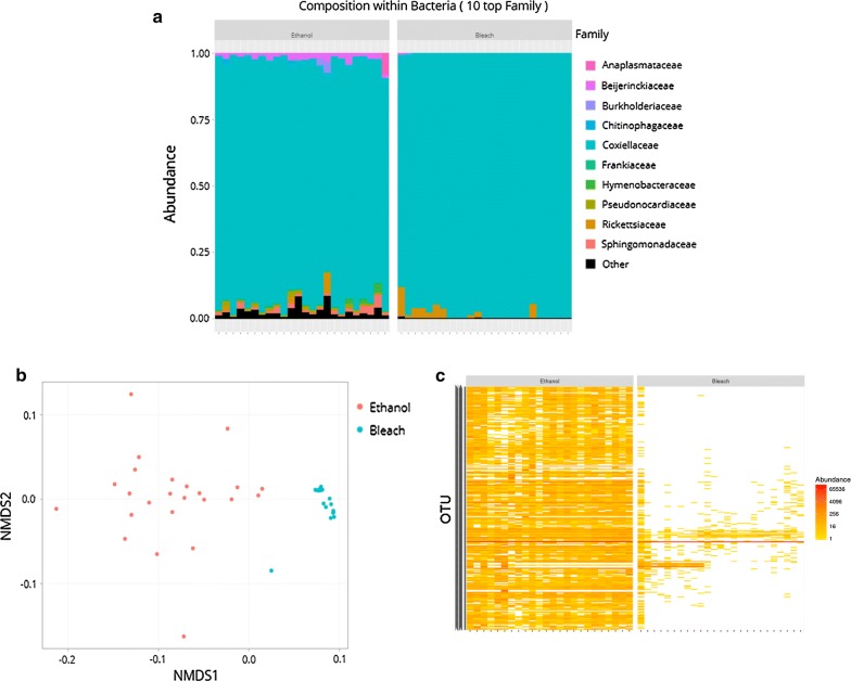 Methods: We examined how these different sterilization methods impact the measure of internal microbial diversity hosted by the Cayenne tick Amblyomma cajennense (sensu stricto). Bacterial barcoding investigations based on 16S rRNA gene sequences were conducted on two batches of 50 individuals each: Ticks of the first batch were sterilized with bleach diluted at 1% and the second batch with 70% ethanol. Tick external microbiome was also determined from cuticle smearing and water samples used for tick washing.