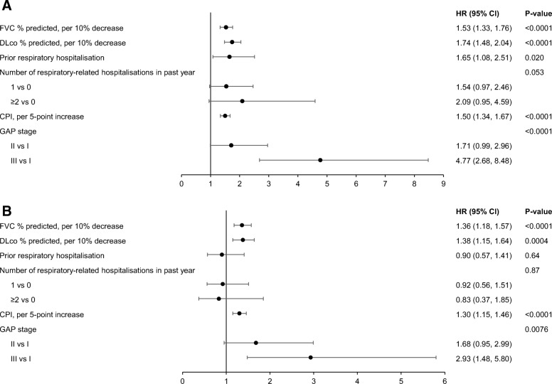 Methods: The analysis cohort comprised patients enrolled in the IPF-PRO Registry from its inception on 5 June 2014 to 26 October 2017. The primary criterion for inclusion in this registry is that patients must be diagnosed or confirmed with IPF at the enrolling centre within 6 months. Associations between patient characteristics and markers of disease severity at enrolment and mortality outcomes were investigated using univariable, multivariable and adjustment models.