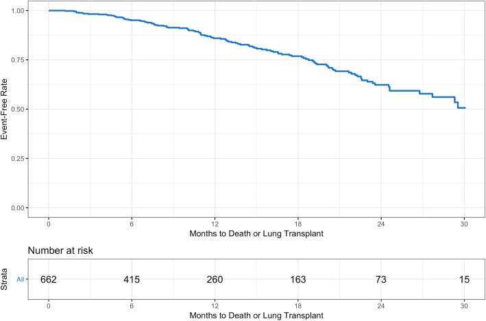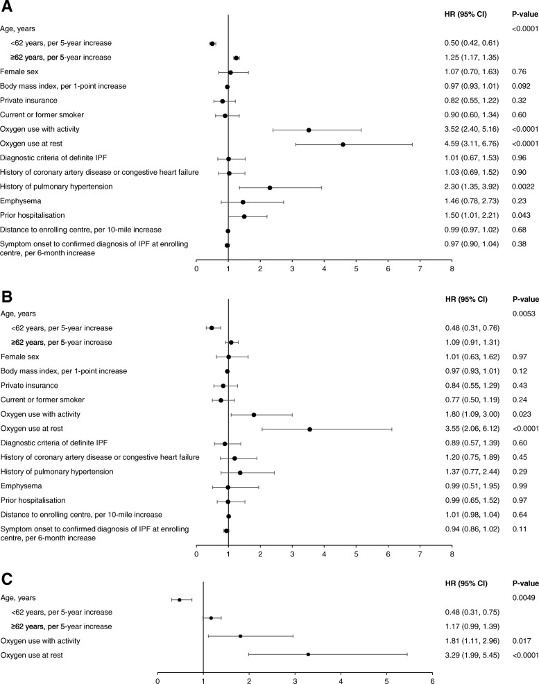 Results: Among 662 patients enrolled, 111 patients died or had a lung transplant over a follow-up period of 30 months. The probability of being free of both events at month 30 was 50.6% (95% CI: 40.0, 60.2). When patient characteristics and markers of disease severity were jointly examined in a multivariable analysis, oxygen use at rest (hazard ratio [HR] 2.44 [95% CI: 1.45, 4.10]), lower forced vital capacity (FVC) % predicted (HR 1.28 [95% CI: 1.10, 1.49] per 10% decrease) and diffusion capacity for carbon monoxide (DLco) % predicted (HR 1.25 [95% CI: 1.04, 1.51] per 10% decrease) were significantly associated with increased risk of death or lung transplant. The risk of death or lung transplant increased with increasing age in patients ≥62 years old (HR 1.18 [95% CI: 0.99, 1.40] per 5-year increase), and decreased with increasing age in patients <62 years old (HR 0.60 [95% CI: 0.39, 0.92] per 5-year increase).