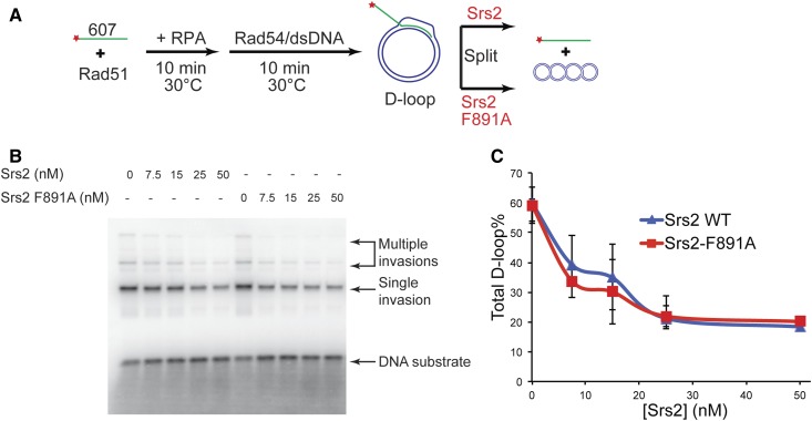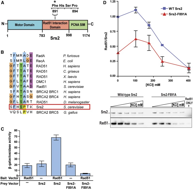 Saccharomyces cerevisiae Srs2, in addition to its well-documented antirecombination activity, has been proposed to play a role in promoting synthesis-dependent strand annealing (SDSA). Here we report the identification and characterization of an SRS2 mutant with a single amino acid substitution (srs2-F891A) that specifically affects the Srs2 pro-SDSA function. This residue is located within the Srs2-Rad51 interaction domain and embedded within a protein sequence resembling a BRC repeat motif. The srs2-F891A mutation leads to a complete loss of interaction with Rad51 as measured through yeast two-hybrid analysis and a partial loss of interaction as determined through protein pull-down assays with purified Srs2, Srs2-F891A, and Rad51 proteins. Even though previous work has shown that internal deletions of the Srs2-Rad51 interaction domain block Srs2 antirecombination activity in vitro, the Srs2-F891A mutant protein, despite its weakened interaction with Rad51, exhibits no measurable defect in antirecombination activity in vitro or in vivo Surprisingly, srs2-F891A shows a robust shift from noncrossover to crossover repair products in a plasmid-based gap repair assay, but not in an ectopic physical recombination assay. Our findings suggest that the Srs2 C-terminal Rad51 interaction domain is more complex than previously thought, containing multiple interaction sites with unique effects on Srs2 activity.