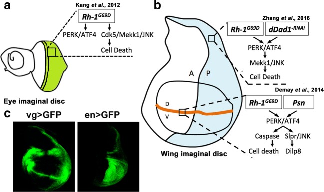 Accumulation of unfolded proteins and calcium dyshomeostasis induces endoplasmic reticulum (ER) stress, which can be resolved by the unfolded protein response (UPR). We have previously reported that activation of the PERK/ATF4 branch of the UPR, by overexpressing Presenilin in part of the vestigial domain of Drosophila wing imaginal discs, induces both a caspase-dependent apoptosis and a Slpr/JNK/Dilp8-dependent developmental delay that allows compensation of cell death in the tissue. Recently, dDad1 depletion in Drosophila in engrailed-expressing cells of wing imaginal discs was also reported to activate the PERK/ATF4 branch but induced Mekk1/JNK-dependent apoptosis. Here, we assessed whether the stressed cell location in the wing imaginal disc could explain these differences in response to chronic ER stress or whether the stress source could be responsible for the signaling discrepancy. To address this question, we overexpressed a Rhodopsin-1 mutant prone to aggregate either in vestigial- or engrailed-expressing cells. We observed similar responses to the Presenilin overexpression in the vestigial domain and to the dDad1 depletion in the engrailed domain. Therefore, the consequences of a PERK/ATF4 branch activation depend on the position of the cell in the Drosophila wing imaginal disc, suggesting interactions of PERK signaling with developmental pathways involved in the determination or maintenance of wing domains.