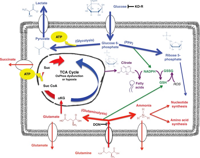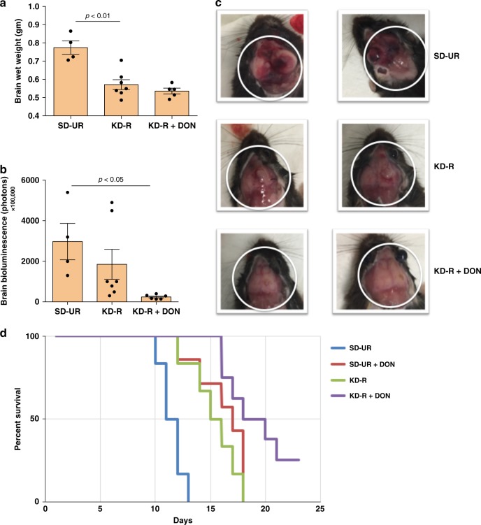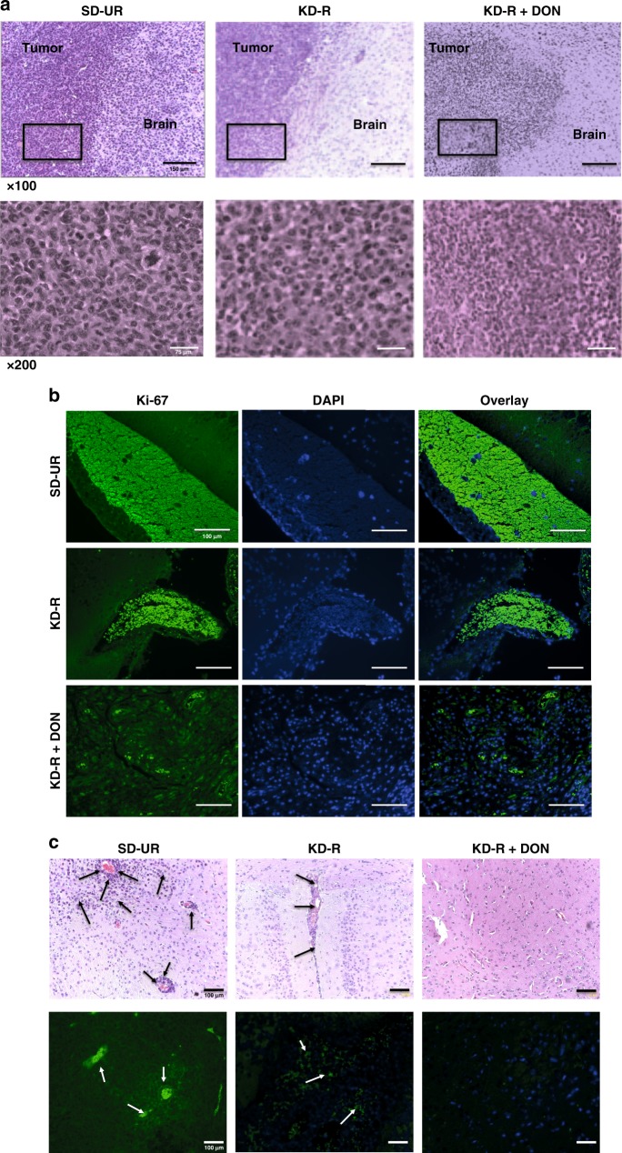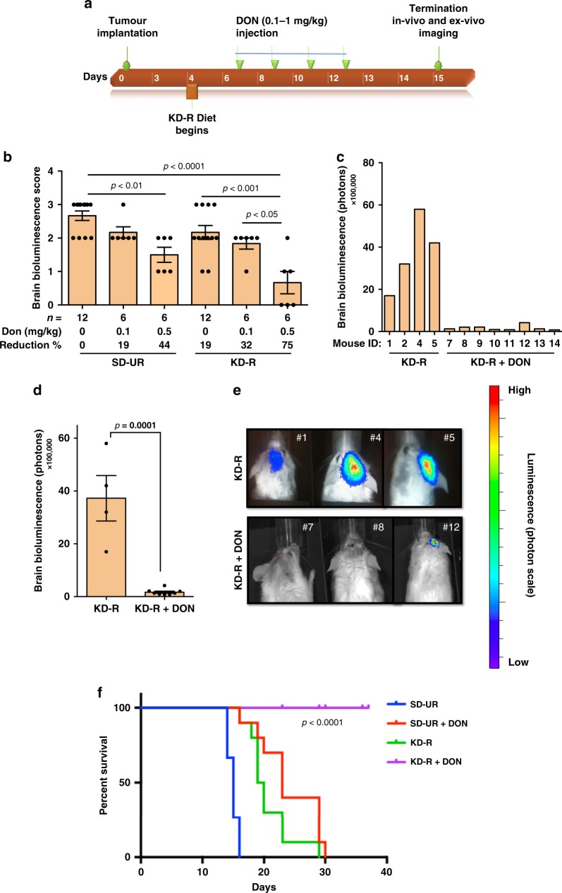 Glioblastoma (GBM) is an aggressive primary human brain tumour that has resisted effective therapy for decades. Although glucose and glutamine are the major fuels that drive GBM growth and invasion, few studies have targeted these fuels for therapeutic management. The glutamine antagonist, 6-diazo-5-oxo-L-norleucine (DON), was administered together with a calorically restricted ketogenic diet (KD-R) to treat late-stage orthotopic growth in two syngeneic GBM mouse models: VM-M3 and CT-2A. DON targets glutaminolysis, while the KD-R reduces glucose and, simultaneously, elevates neuroprotective and non-fermentable ketone bodies. The diet/drug therapeutic strategy killed tumour cells while reversing disease symptoms, and improving overall mouse survival. The therapeutic strategy also reduces edema, hemorrhage, and inflammation. Moreover, the KD-R diet facilitated DON delivery to the brain and allowed a lower dosage to achieve therapeutic effect. The findings support the importance of glucose and glutamine in driving GBM growth and provide a therapeutic strategy for non-toxic metabolic management.