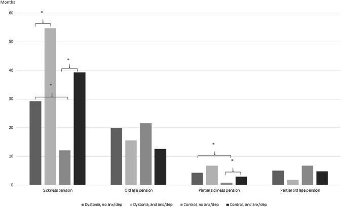 Results: Most prominent comorbidities with primary focal CD were depression (14%), anxiety (7%), and back pain (11%). The retirement age was significantly younger in CD patients compared to control group controls (59.0 years, 95% CI 58.5-59.5 vs. 61.7 years, 95% CI 61.6-61.9) years, p < 0.001). For dystonia patients the most common diagnoses for retirement due to sickness were dystonia (51%), depression (14%), and anxiety (8%). Patients with anxiety and depression retired earlier than other dystonia patients.
