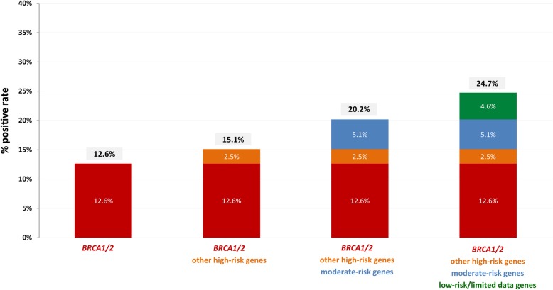 Conclusions: In our cohort, analysis of all the genes in the panel allowed the identification of 4.3 and 8.1% additional pathogenic variants in other high or moderate/low risk genes, respectively, enabling personalized management decisions for these individuals and supporting the clinical significance of multigene panel analysis in hereditary cancer predisposition.