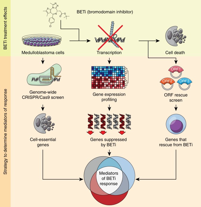 BET-bromodomain inhibition (BETi) has shown pre-clinical promise for MYC-amplified medulloblastoma. However, the mechanisms for its action, and ultimately for resistance, have not been fully defined. Here, using a combination of expression profiling, genome-scale CRISPR/Cas9-mediated loss of function and ORF/cDNA driven rescue screens, and cell-based models of spontaneous resistance, we identify bHLH/homeobox transcription factors and cell-cycle regulators as key genes mediating BETi's response and resistance. Cells that acquire drug tolerance exhibit a more neuronally differentiated cell-state and expression of lineage-specific bHLH/homeobox transcription factors. However, they do not terminally differentiate, maintain expression of CCND2, and continue to cycle through S-phase. Moreover, CDK4/CDK6 inhibition delays acquisition of resistance. Therefore, our data provide insights about the mechanisms underlying BETi effects and the appearance of resistance and support the therapeutic use of combined cell-cycle inhibitors with BETi in MYC-amplified medulloblastoma.