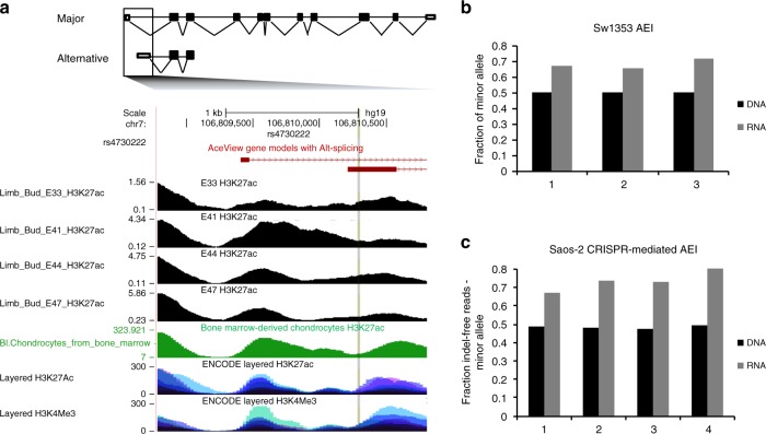 To date, genome-wide association studies have implicated at least 35 loci in osteoarthritis but, due to linkage disequilibrium, the specific variants underlying these associations and the mechanisms by which they contribute to disease risk have yet to be pinpointed. Here, we functionally test 1,605 single nucleotide variants associated with osteoarthritis for regulatory activity using a massively parallel reporter assay. We identify six single nucleotide polymorphisms (SNPs) with differential regulatory activity between the major and minor alleles. We show that the most significant SNP, rs4730222, exhibits differential nuclear protein binding in electrophoretic mobility shift assays and drives increased expression of an alternative isoform of HBP1 in a heterozygote chondrosarcoma cell line, in a CRISPR-edited osteosarcoma cell line, and in chondrocytes derived from osteoarthritis patients. This study provides a framework for prioritization of GWAS variants and highlights a role of HBP1 and Wnt signaling in osteoarthritis pathogenesis.