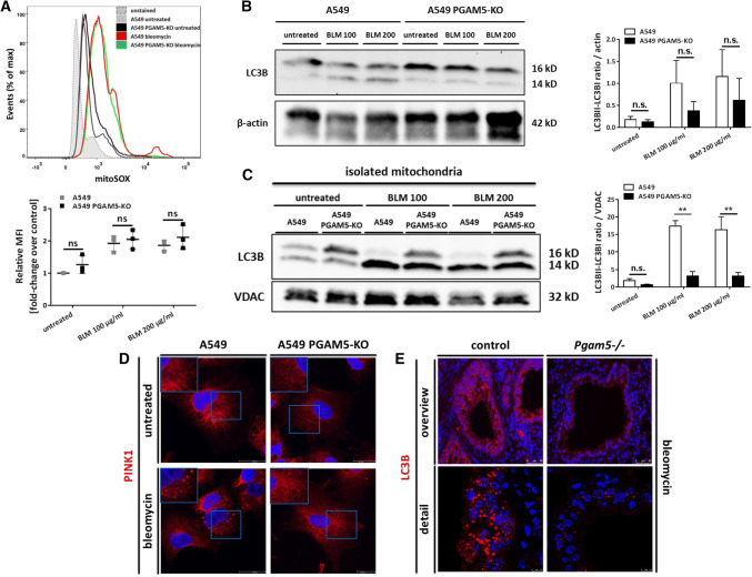 Methods: PGAM5-deficient mice and human pulmonary epithelial cells were analyzed comparatively with PGAM5-proficient controls in a bleomycin-based model of pulmonary fibrogenesis. Mitochondria were visualized by confocal and transmission electron microscopy. Mitochondrial homeostasis was assessed using JC1 (ΔΨ) and flow cytometry.
