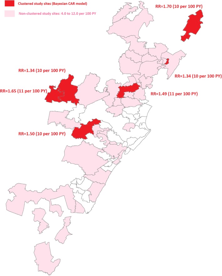 Methods: HIV incidence rates from 7557 South African women enrolled in five community-based HIV prevention trials (2002-2012) were mapped using participant household global positioning system (GPS) coordinates. Age and period standardized HIV incidence rates were calculated for 43 recruitment clusters across greater Durban. Bayesian conditional autoregressive areal spatial regression (CAR) was used to identify significant patterns and clustering of new HIV infections in recruitment communities.
