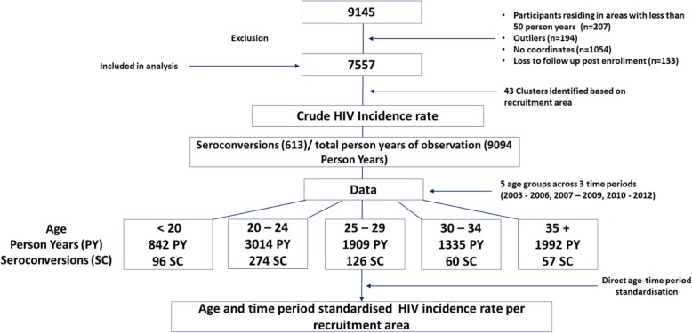Results: The total person-time in the cohort was 9093.93 years and 613 seroconversions were observed. The overall crude HIV incidence rate across all communities was 6·74 per 100PY (95% CI: 6·22-7·30). 95% of the clusters had HIV incidence rates greater than 3 per 100PY. The CAR analysis identified six communities with significantly high HIV incidence. Estimated relative risks for these clusters ranged from 1.34 to 1.70. Consistent with these results, age standardized HIV incidence rates were also highest in these clusters and estimated to be 10 or more per 100 PY. Compared to women 35+ years old younger women were more likely to reside in the highest incidence areas (aOR: 1·51, 95% CI: 1·06-2·15; aOR: 1.59, 95% CI: 1·19-2·14 and aOR: 1·62, 95% CI: 1·2-2·18 for < 20, 20-24, 25-29 years old respectively). Partnership factors (2+ sex partners and being unmarried/not cohabiting) were also more common in the highest incidence clusters (aOR 1.48, 95% CI: 1.25-1.75 and aOR 1.54, 95% CI: 1.28-1.84 respectively).