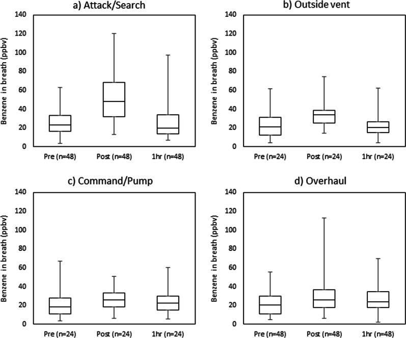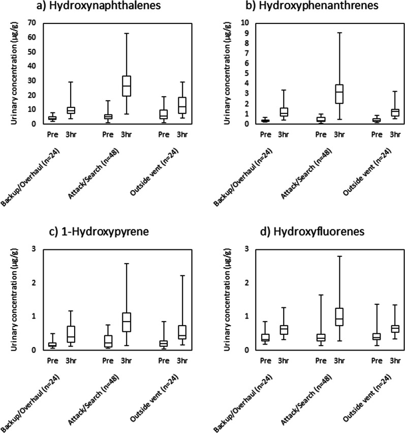 To better understand the absorption of combustion byproducts during firefighting, we performed biological monitoring (breath and urine) on firefighters who responded to controlled residential fires and examined the results by job assignment and fire attack tactic. Urine was analyzed for metabolites of polycyclic aromatic hydrocarbons (PAHs) and breath was analyzed for volatile organic compounds (VOCs) including benzene. Median concentrations of PAH metabolites in urine increased from pre-firefighting to 3-h post firefighting for all job assignments. This change was greatest for firefighters assigned to attack and search with 2.3, 5.6, 3.9, and 1.4-fold median increases in pyrene, phenanthrene, naphthalene, and fluorene metabolites. Median exhaled breath concentrations of benzene increased 2-fold for attack and search firefighters (p < 0.01) and 1.4-fold for outside vent firefighters (p = 0.02). Compared to interior attack, transitional attack resulted in 50% less uptake of pyrene (p = 0.09), 36% less uptake phenanthrene (p = 0.052), and 20% less uptake of fluorene (p < 0.01). Dermal absorption likely contributed to firefighters' exposures in this study. Firefighters' exposures will vary by job assignment and can be reduced by employing a transitional fire attack when feasible.