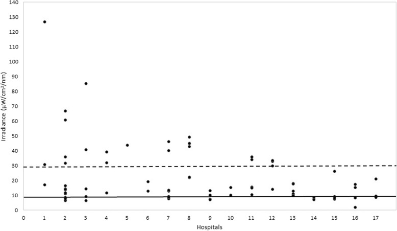 Results: In nine hospitals the irradiance levels were less than required for standard PT: < 10 μW/cm2/nm and in eight hospitals irradiance failed to reach the levels for intensive phototherapy: 30 μW/cm2/nm. Three hospitals provided very high irradiance levels: > 50 μW/cm2/nm. Half of the distances between device and model were greater than recommended. Distance was inversely correlated with irradiance levels (R2 = 0.1838; P < 0.05). The effect of curtains on irradiance levels was highly variable, ranging from - 6.15 to + 15.4 μW/cm2/nm, with a mean difference (SD) of 1.82 (3.81) μW/cm2/nm (P = 0.486).