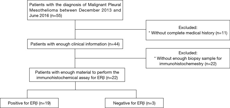 Methods: This was a retrospective single center study that analyzed the response of malignant pleural mesothelioma with an expression of ERβ to first-line chemotherapy. The study included patients with pleural mesothelioma pathologically confirmed between 2013 and 2016 at the National Institute for Respiratory Disease (INER), who underwent an immunohistochemistry assay for ERβ (mouse monoclonal antibody PPG5/10). The primary endpoint was the response to chemotherapy based on RECIST 1.1 according to the ERβ expression; secondary outcomes were the overall survival (OS) and progression-free survival (PFS).