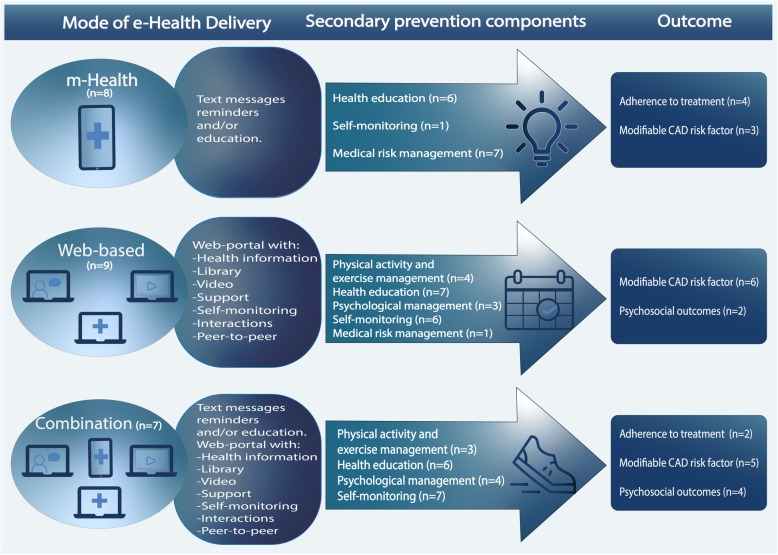 Background: Electronic health (e-Health) interventions are emerging as an effective alternative model for improving secondary prevention of coronary artery disease (CAD). The aim of this study was to describe the effectiveness of different modes of delivery and components in e-Health secondary prevention programmes on adherence to treatment, modifiable CAD risk factors and psychosocial outcomes for patients with CAD.