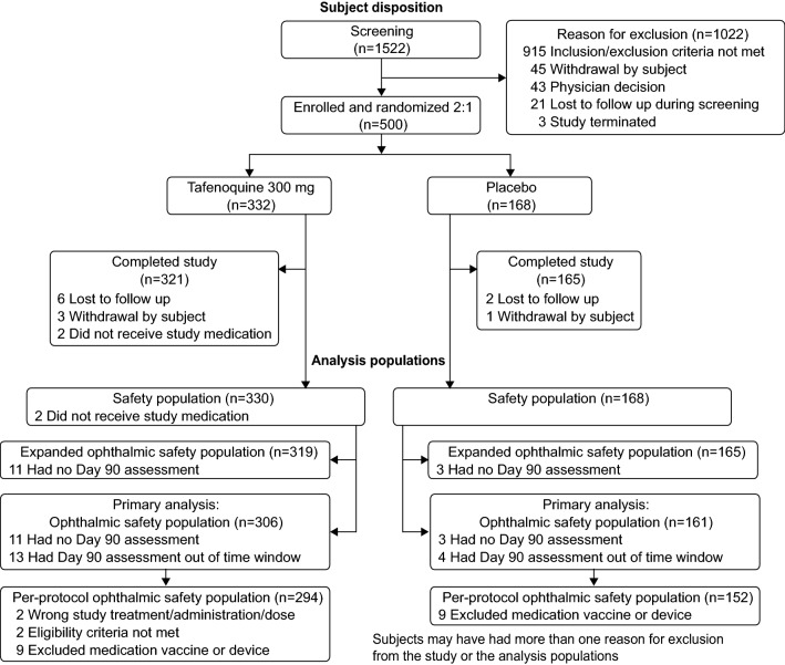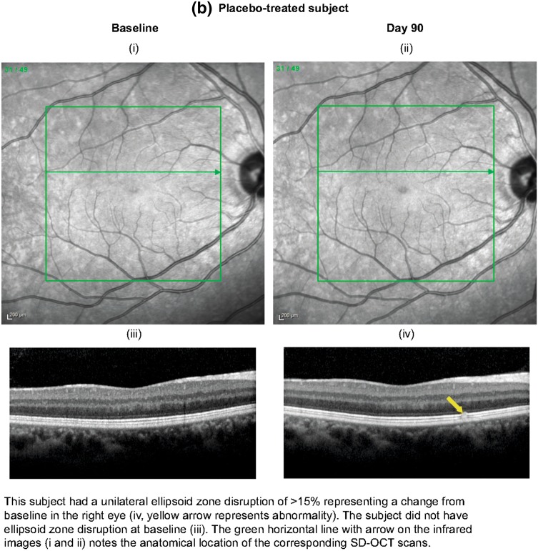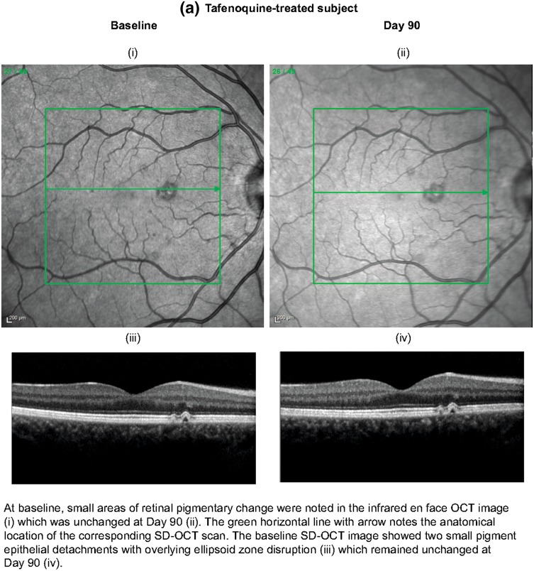 Results: One subject in each group met the composite primary endpoint for retinal changes identified with SD-OCT or FAF, i.e., one out of 306 (0.3%) with tafenoquine, one out of 161 (0.6%) with placebo. Both cases had unilateral focal ellipsoid zone disruption at day 90 with no effect on best-corrected visual acuity. The tafenoquine-treated subject had this abnormality at baseline, and was enrolled in error. There was no difference in ophthalmic safety between tafenoquine and placebo.