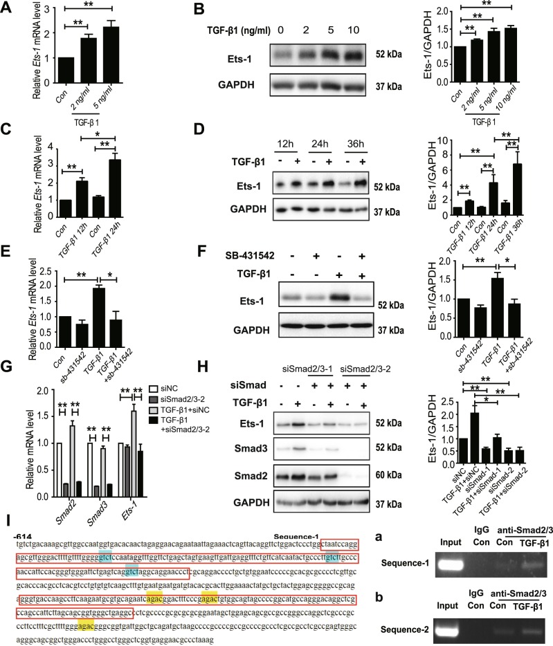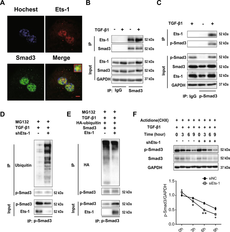 Hepatocyte apoptosis is a hallmark of nonalcoholic steatohepatitis (NASH) and contributes to liver injury, fibrosis, and inflammation. However, the molecular mechanisms underlying excessive hepatocyte apoptosis in NASH remain largely unknown. This study aimed to explore whether and how the v-ets avian erythroblastosis virus E26 oncogene homolog 1 (Ets-1) is involved in diet-induced hepatocyte apoptosis in mice. The study found that the expression level of hepatic Ets-1 was elevated in a NASH mouse model as a result of the activation of transforming growth factor beta1 (TGF-β1) signaling. In the presence of TGF-β1, phosphorylated mothers against decapentaplegic homolog 2/3 (p-Smad2/3) translocated to the binding sites of the Ets-1 promoter to upregulate the expression of Ets-1 in primary hepatocytes. In addition, Ets-1 bound directly to phosphorylated Smad3 (p-Smad3), thereby preventing the ubiquitination and proteasomal degradation of p-Smad3 and enhancing the activity of TGF-β1/Smad3 signaling. Consequently, elevated Ets-1 stimulated TGF-β1-induced hepatocyte apoptosis. However, Ets-1 knockdown alleviated diet-induced hepatocyte apoptosis and NASH with reduced liver injury, inflammation, and fibrosis. Taken together, Ets-1 had an adverse impact on hepatocyte survival under TGF-β1 treatment and accelerated the development of NASH in mice.