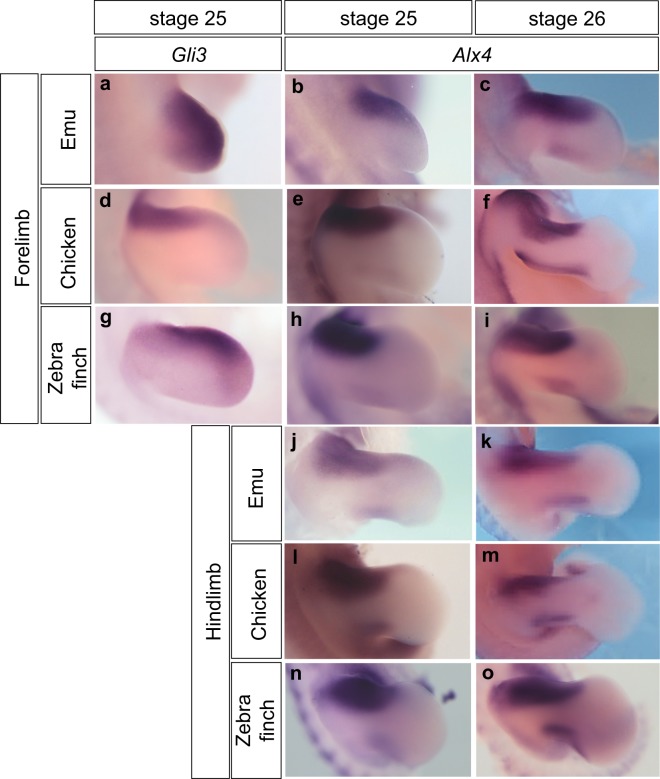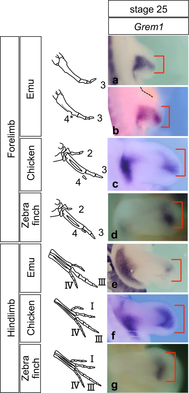 Variation in digit number has occurred multiple times in the history of archosaur evolution. The five digits of dinosaur limbs were reduced to three in bird forelimbs, and were further reduced in the vestigial forelimbs of the emu. Regulation of digit number has been investigated previously by examining genes involved in anterior-posterior patterning in forelimb buds among emu (Dromaius novaehollandiae), chicken (Gallus gallus) and zebra finch (Taeniopygia guttata). It was described that the expression of posterior genes are conserved among these three birds, whereas expression of anterior genes Gli3 and Alx4 varied significantly. Here we re-examined the expression pattern of Gli3 and Alx4 in the forelimb of emu, chicken and zebra finch. We found that Gli3 is expressed in the anterior region, although its range varied among species, and that the expression pattern of Alx4 in forelimb buds is broadly conserved in a stage-specific manner. We also found that the dynamic expression pattern of the BMP antagonist Gremlin1 (Grem1) in limb buds, which is critical for autopodial expansion, was consistent with the digital pattern of emu, chicken and zebra finch. Furthermore, in emu, variation among individuals was observed in the width of Grem1 expression in forelimb buds, as well as in the adult skeletal pattern. Our results support the view that the signalling system that regulates the dynamic expression of Grem1 in the limb bud contributes substantially to variations in avian digital patterns.