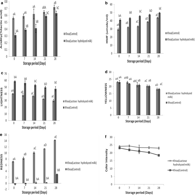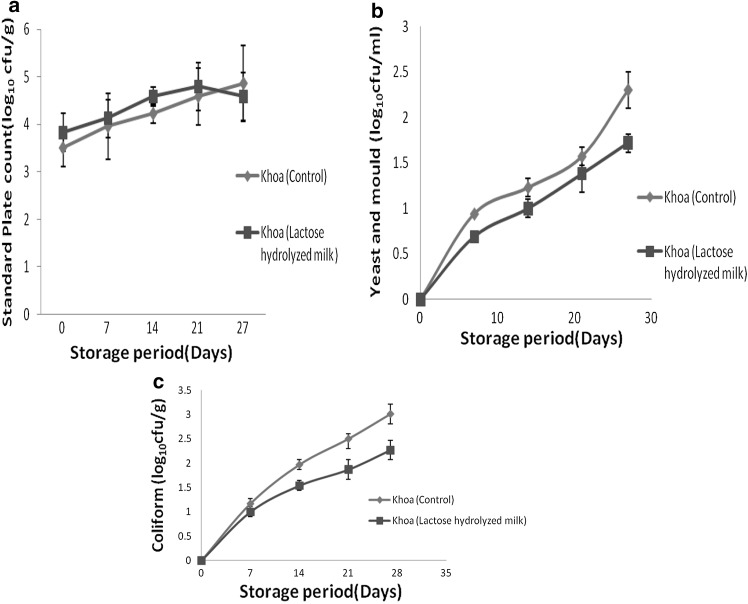 Lactose is a reducing sugar which is abundantly found in mammalian milk. Lactose intolerance affects more than 70% of the world population, being apparent by the absence of β-galactosidase enzyme, thus leading to the inability to consume dairy products. In the present work, Khoa was prepared from lactose hydrolysed milk and its physico-chemical, textural and microbiological quality were examined during storage at 5-7 °C for 28 days. The sensory quality of low lactose Khoa was comparable with that of the control Khoa up to the 14th day of storage. Significant differences (p < 0.05) between the acidity, hydroxyl methyl furfural (HMF) content, lightness, redness, springiness, chewiness and hardness values of the low lactose Khoa and the control Khoa were observed. The standard plate count (SPC), coliform and yeast and mould counts of the low lactose Khoa were within Food safety and standards authority of India (FSSAI) standards throughout the 28 days of storage. Therefore, the low lactose Khoa developed in this study had different physicochemical properties from the control sample with better shelf life.