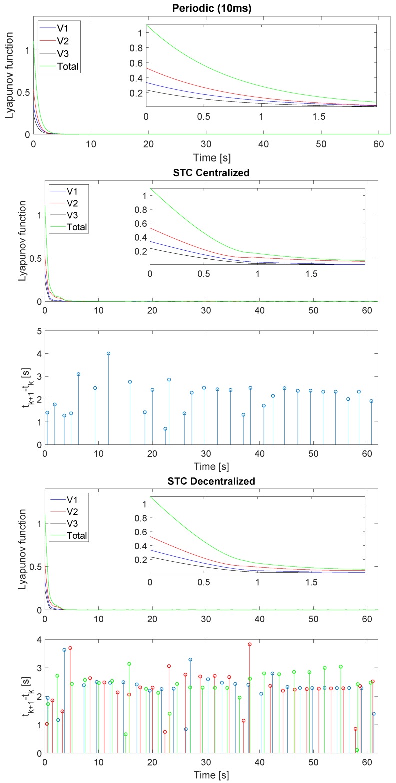 Keywords: formation control; nonlinear trajectory tracking; practical stability; real-time scheduling; remote guidance; self-triggered Lyapunov control.