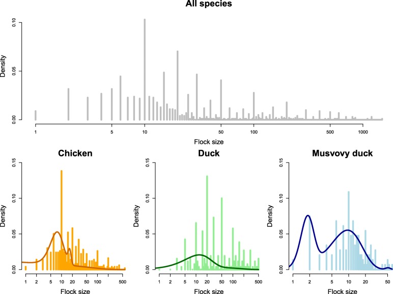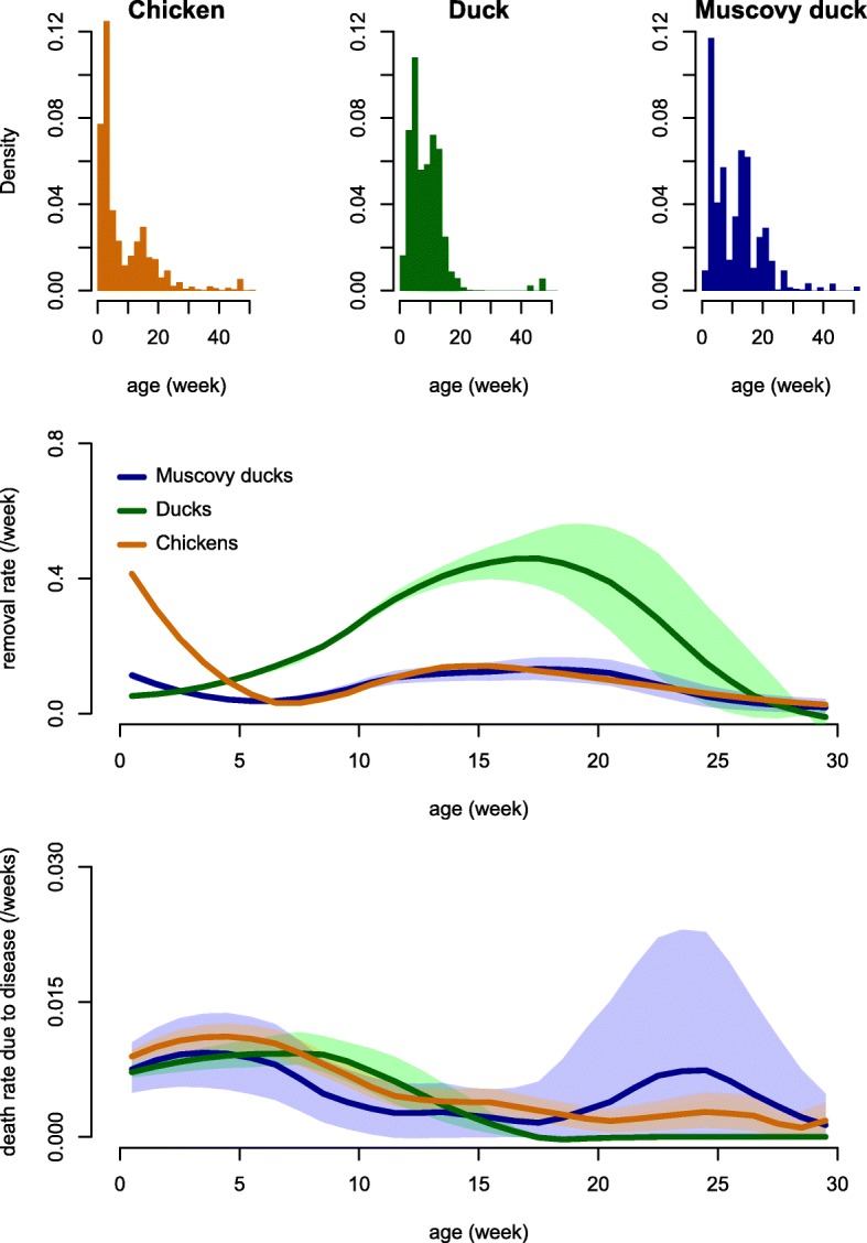 Results: Median flock population sizes were 16 for chickens (IQR: 10-40), 32 for ducks (IQR: 18-101) and 11 for Muscovy ducks (IQR: 7-18); farm size distributions for the three species were heavily right-skewed. Muscovy ducks were kept for long periods and outdoors, while chickens and ducks were farmed indoors or in pens. Ducks had a markedly higher removal rate (broilers: 0.14/week; layer/breeders: 0.05/week) than chickens and Muscovy ducks (broilers: 0.07/week; layer/breeders: 0.01-0.02/week) and a higher degree of specialization resulting in a substantially shorter life span. The rate of mortality due to disease did not differ much among species, with birds being less likely to die from disease at older ages, but frequency of disease symptoms differed by species. Time series of disease-associated mortality were correlated with population size for Muscovy ducks (Kendall's coefficient τ = 0.49, p-value < 0.01) and with frequency of outdoor grazing for ducks (τ = 0.33, p-value = 0.05).