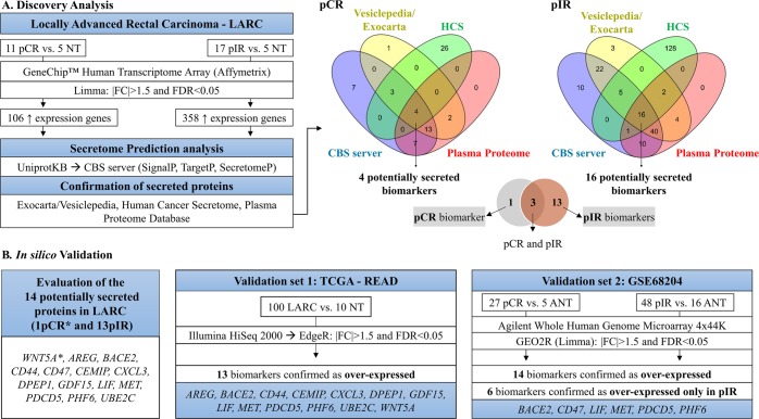 Most patients with locally advanced rectal cancer (LARC) present incomplete pathological response (pIR) to neoadjuvant chemoradiotherapy (nCRT). Despite the efforts to predict treatment response using tumor-molecular features, as differentially expressed genes, no molecule has proved to be a strong biomarker. The tumor secretome analysis is a promising strategy for biomarkers identification, which can be assessed using transcriptomic data. We performed transcriptomic-based secretome analysis to select potentially secreted proteins using an in silico approach. The tumor expression profile of 28 LARC biopsies collected before nCRT was compared with normal rectal tissues (NT). The expression profile showed no significant differences between complete (pCR) and incomplete responders to nCRT. Genes with increased expression (pCR = 106 and pIR = 357) were used for secretome analysis based on public databases (Vesiclepedia, Human Cancer Secretome, and Plasma Proteome). Seventeen potentially secreted candidates (pCR = 1, pIR = 13 and 3 in both groups) were further investigated in two independent datasets (TCGA and GSE68204) confirming their over-expression in LARC and association with nCRT response (GSE68204). The expression of circulating amphiregulin and cMET proteins was confirmed in serum from 14 LARC patients. Future studies in liquid biopsies could confirm the utility of these proteins for personalized treatment in LARC patients.