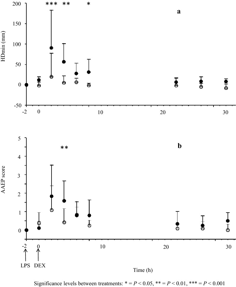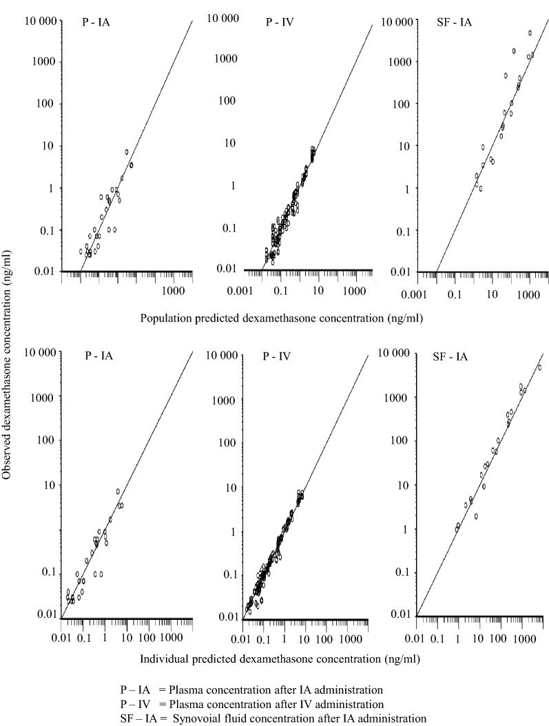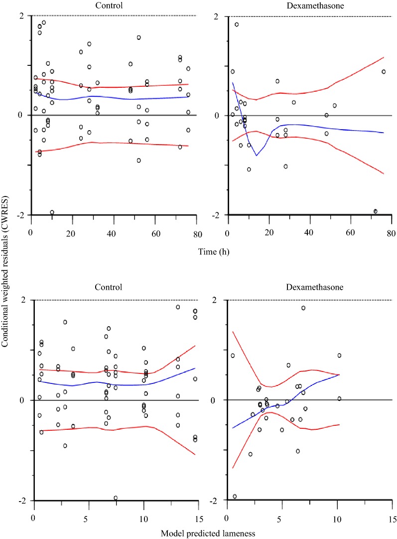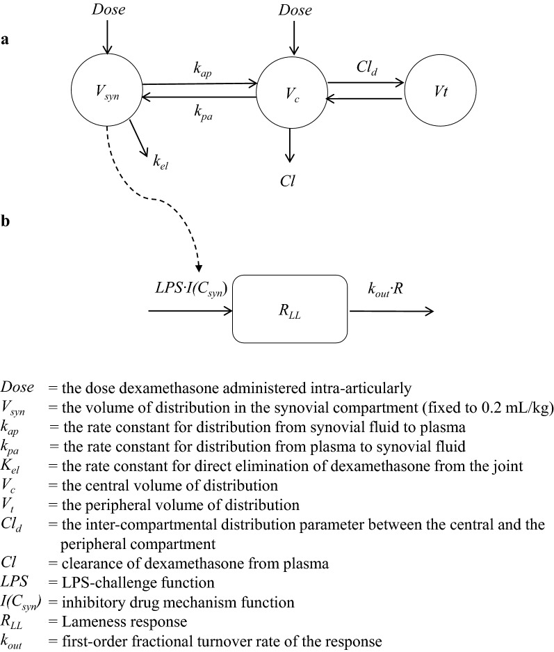 Results: Inflammation was induced in the radiocarpal joint of six horses by injection of 2 ng lipopolysaccharide (LPS). Two hours later either saline or dexamethasone was injected in the same joint in a two treatment cross over design. Each horse was treated once with one of the six doses dexamethasone used (0.01, 0.03, 0.1, 0.3, 1 or 3 mg) and once with saline. Dexamethasone was quantified by means of UHPLC-MS/MS. Dexamethasone disposition was characterised by means of a non-linear mixed effects model. Lameness was evaluated both objectively with an inertial sensor based system and subjectively scored using a numerical scale (0-5). Joint circumference, skin temperature over the joint and rectal temperature were also recorded. The LPS-challenge induced lameness in all horses with high inter-individual variability. Dexamethasone significantly decreased lameness compared with saline. Other variables were not statistically significant different between treatments. Objective lameness scoring was the most sensitive method used in this study to evaluate the lameness response. A pharmacokinetic/pharmacodynamic model was successfully fitted to experimental dexamethasone and lameness data. The model allowed characterization of the dexamethasone synovial fluid concentration-time course, the systemic exposure to dexamethasone after intra-articular administration and the concentration-response relation in an experimental model of synovitis.