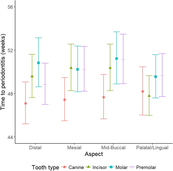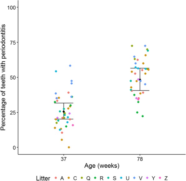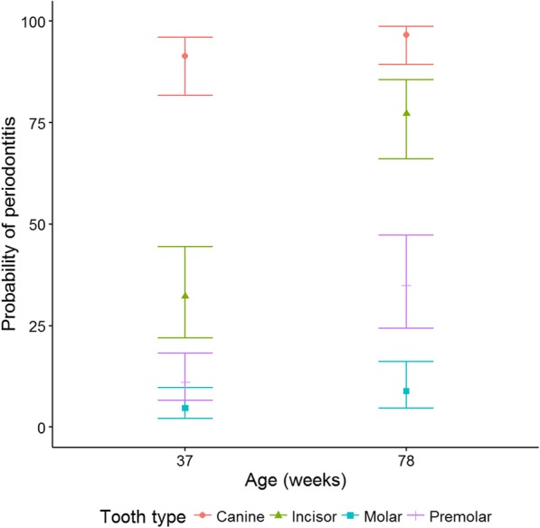 Results: Of the 49 dogs assessed at 37 weeks of age, 98% had at least one tooth or aspect with early periodontitis (PD2, < 25% attachment loss). The average percentage of teeth with periodontitis in the mouth was 29.6% with 95% confidence interval (23.6, 36.4). The odds of early periodontitis was 2.74 (2.23, 3.37) times higher at 78 weeks of age compared to 37 weeks of age. The canine teeth had a significantly higher probability of periodontitis compared to all other tooth types at both 37 and 78 weeks of age (p < 0.001). In addition, at the same time points, the incisors had a significantly higher probability of periodontitis compared to the molars and premolars (p < 0.001).