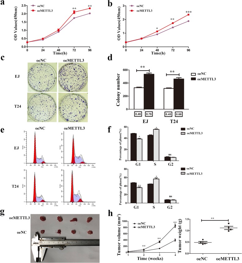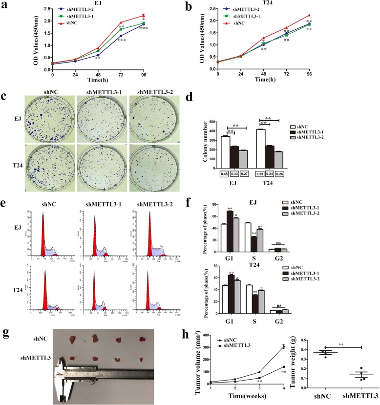 Background: METTL3 is known to be involved in all stages in the life cycle of RNA. It affects the tumor formation by the regulation the m6A modification in the mRNAs of critical oncogenes or tumor suppressors. In bladder cancer, METTL3 could promote the bladder cancer progression via AFF4/NF-κB/MYC signaling network by an m6A dependent manner. Recently, METTL3 was also found to affect the m6A modification in non-coding RNAs including miRNAs, lincRNAs and circRNAs. However, whether this mechanism is related to the proliferation of tumors induced by METTL3 is not reported yet.