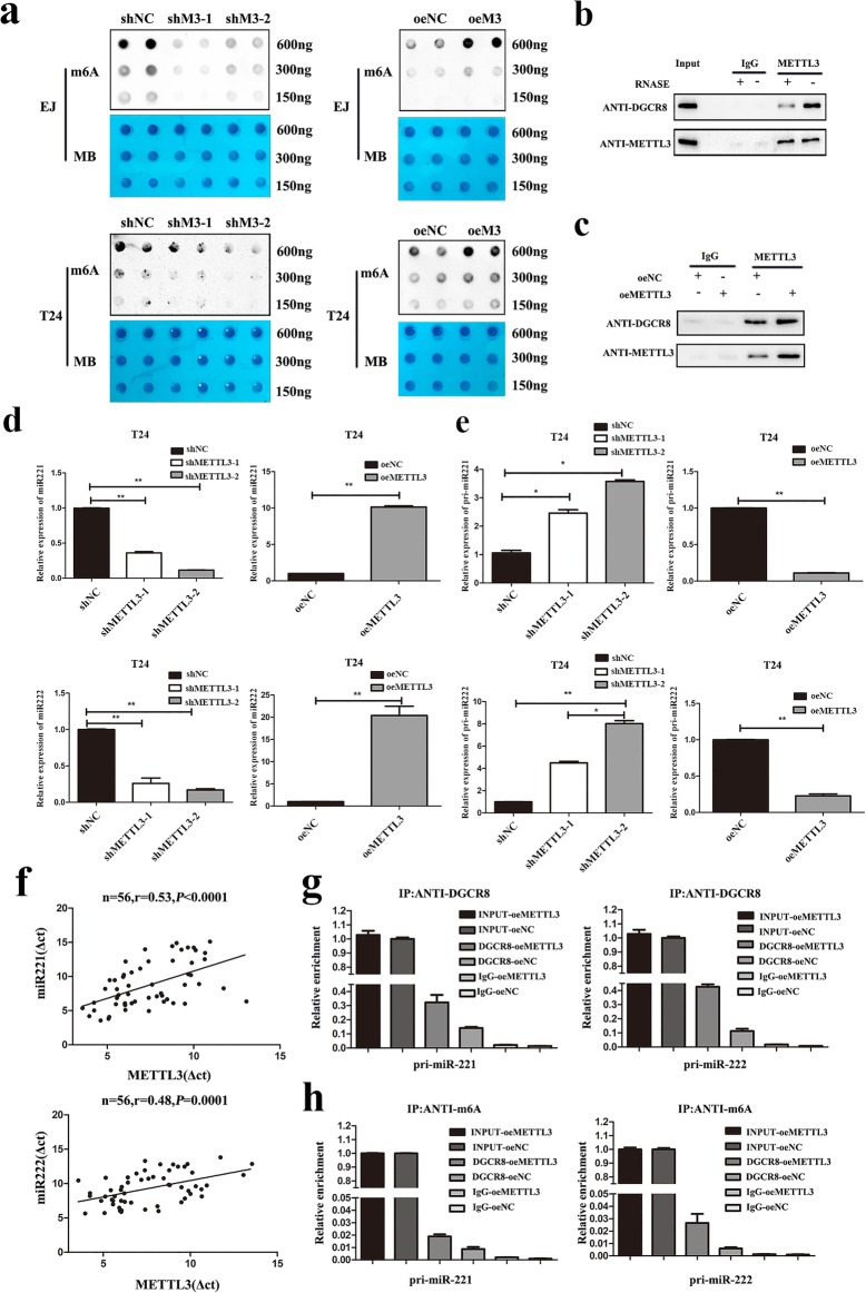 Conclusions: Our findings suggested that METTL3 may have an oncogenic role in bladder cancer through interacting with the microprocessor protein DGCR8 and positively modulating the pri-miR221/222 process in an m6A-dependent manner. To our knowledge, this is the first comprehensive study that METTL3 affected the tumor formation by the regulation the m6A modification in non-coding RNAs, which might provide fresh insights into bladder cancer therapy.