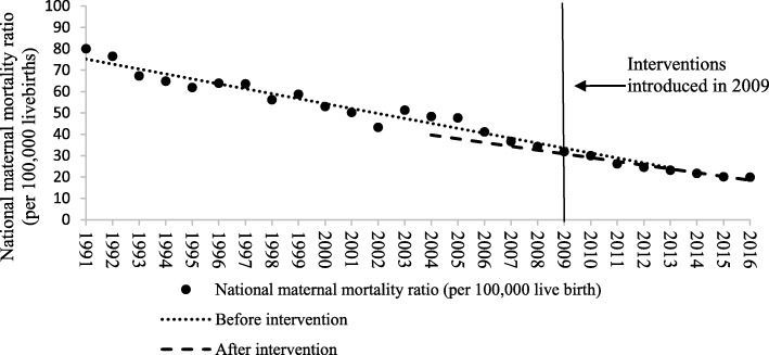 Methods: We conducted a longitudinal study on maternal mortality ratio by extracting mortality data from the National Maternal Mortality Surveillance System (1991-2016) and maternal health services measures from the China health statistic yearbook (2001-2016). We utilized the segmented linear regression model to assess changes and trends of maternal mortality ratio and maternal health services before and after the introduction of Basic Public Health Service project. Pearson correlation analysis was conducted to measure the strength of association between the maternal mortality ratio and maternal health services.