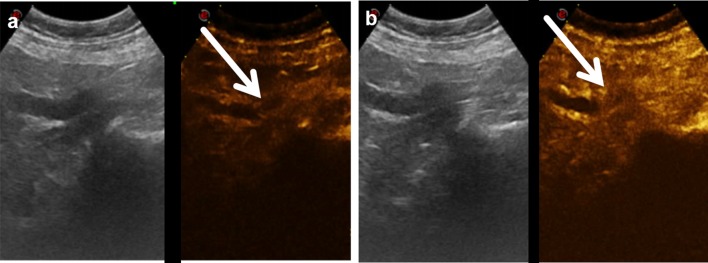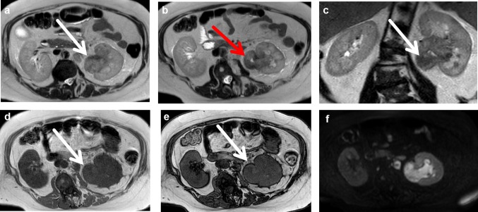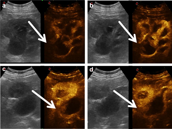 A 58-year-old woman complaining of dyspnea and mild flank pain was admitted to our radiology department after undergoing ultrasonography in another institution. She showed hydronephrosis and left kidney swelling. We performed a contrast-enhanced computed tomography (CECT) that confirmed the hydronephrosis and revealed a widely hypoperfused left kidney, a concentric thickening of the proximal ureter, and a slight and diffuse thickening of the renal pelvic wall, with a hyperdense content in the unenhanced CT phase and poor contrast enhancement in the post-contrast phases. A proximal ipsilateral renal vein thrombosis was associated. Non-contrast magnetic resonance imaging confirmed the CECT findings. At the same time, we performed a contrast-enhanced ultrasonography examination, which proved to be helpful for the characterization of the lesion and for patient management.