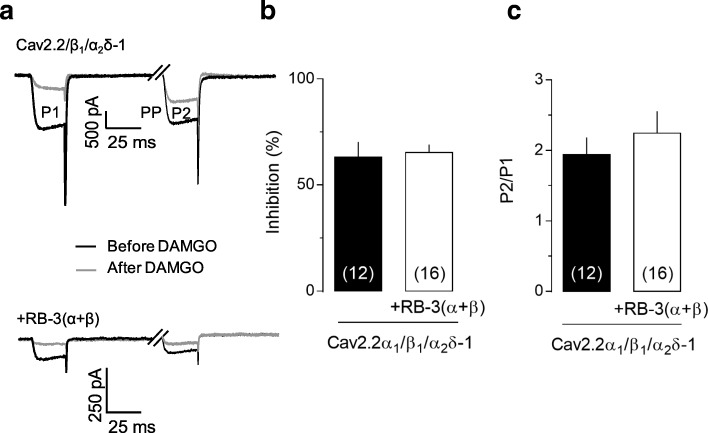 This study describes the interaction between Cav2 calcium channels and Rabconnectin-3, a di-subunit protein that is associated with synaptic vesicles. Immunostaining reveals that both Rabconnectin-3α (RB-3α) and Rabconnectin-3β (RB-3β) are colocalized in mouse hippocampal neurons. Co-immunoprecipitations from brain tissue is consistent with the formation of a protein complex between RB-3α and RB-3β and both Cav2.2 and the related Cav2.1 calcium channel. The coexpression of either RB-3α or RB-3β with Cav2.2 calcium channels in tsA-201 cells led to a reduction in Cav2.2 current density without any effects on the voltage-dependence of activation or inactivation. Coexpression of both Rabconnectin-3 subunits did not cause an additive effect on current densities. Finally, the presence of Rabconnectin-3 did not interfere with μ-opioid receptor mediated Gβγ modulation of Cav2.2 channels. Altogether, our findings show that Rabconnectin-3 has the propensity to regulate calcium entry mediated by Cav2.2 channels.